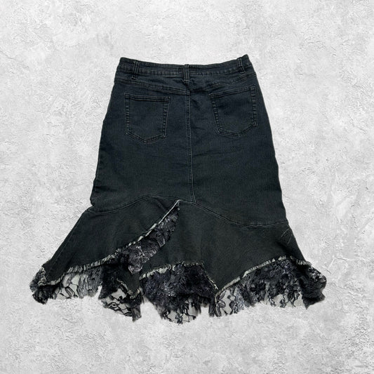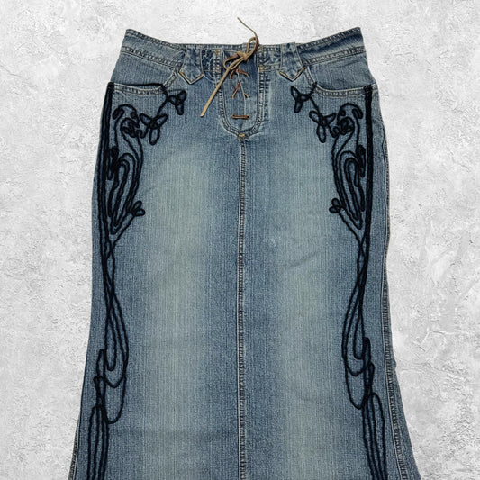 Armor Jeans Embroidered Lace Up Denim Maxi Skirt